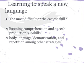This document discusses factors that affect speaking in a second language, including linguistic, pragmatic, and sociocultural considerations. It notes that speaking is often the most difficult skill to learn as it requires comprehending and producing language in real time while attending to social and contextual cues. The document outlines strategies for developing speaking abilities, such as role plays, discussions, using compensatory strategies, and receiving feedback. It emphasizes the importance of authentic speaking practice and developing sociopragmatic competence to communicate effectively in a new language.