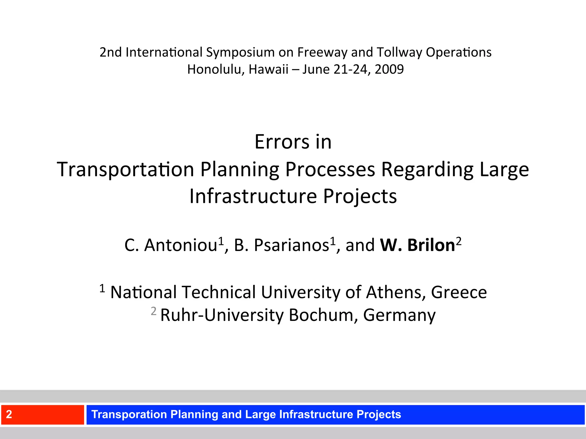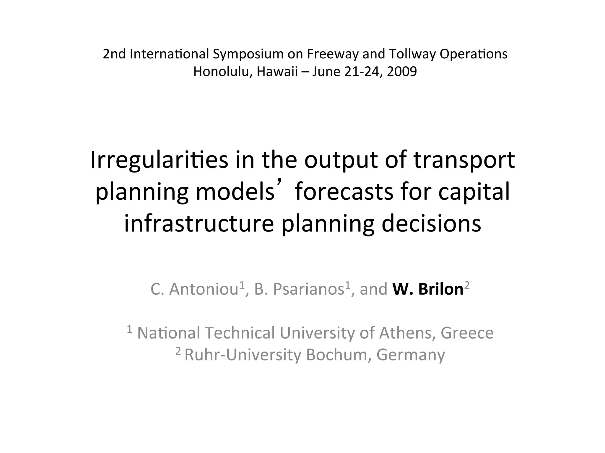 The document discusses issues in transportation planning models, highlighting significant inaccuracies in traffic forecasts for major infrastructure projects, specifically the Auki Odos motorway in Athens, Greece. It emphasizes the importance of considering induced traffic and critiques traditional modeling methods that fail to accommodate uncertainties. Major findings from case studies indicate that developed areas show moderate growth due to existing infrastructure, while less developed areas experience significantly higher growth rates post-implementation.