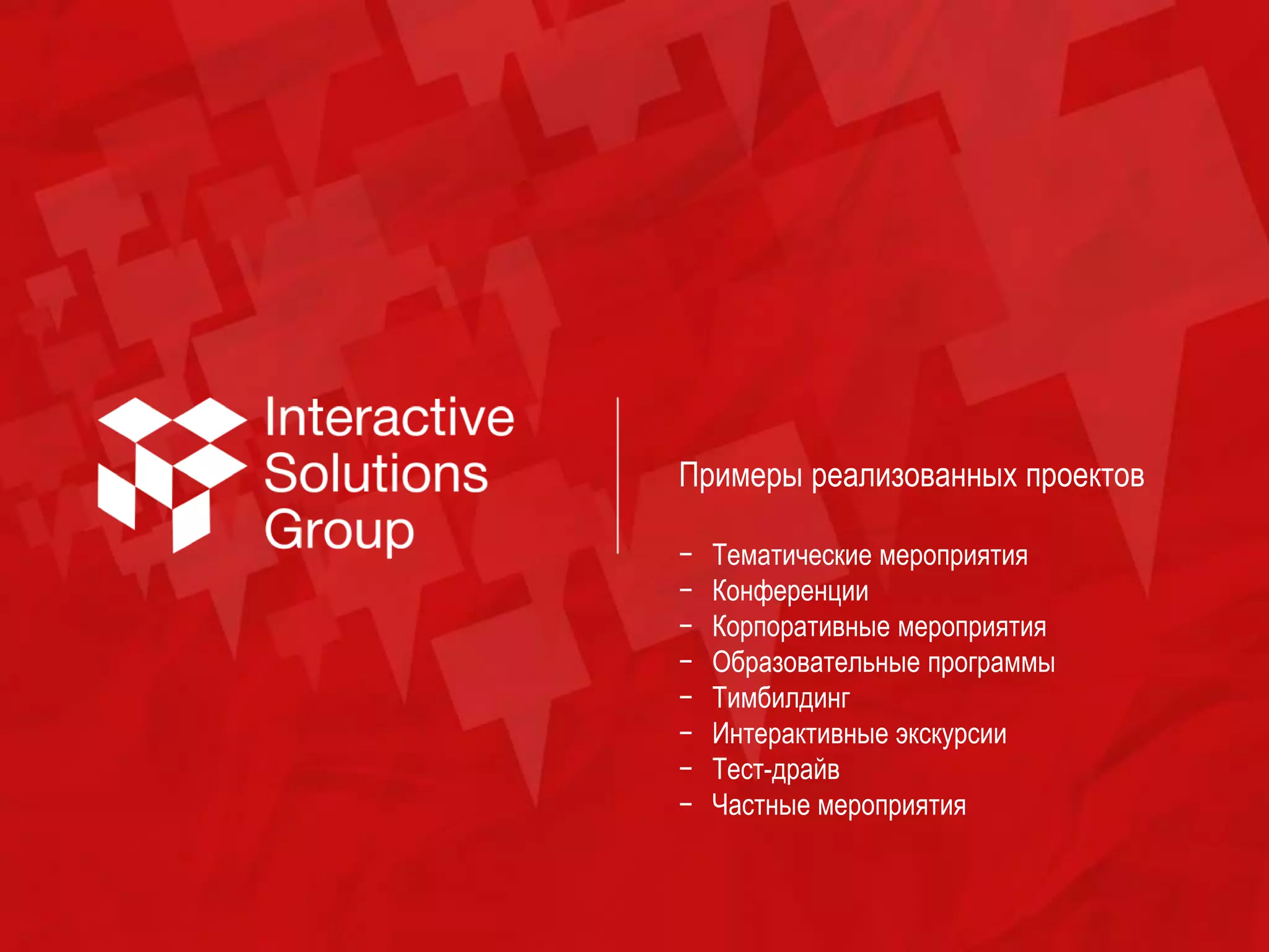 Документ описывает успешные проекты компании Interactive Solutions Group, включая тимбилдинг, корпоративные мероприятия и конференции, которые были проведены для различных клиентов, таких как Газпром Нефть и Сбербанк России. Каждый проект включает уникальные интерактивные элементы и позволяет участникам развивать командные навыки и лояльность к бренду, а также получать новые знания. Документ также содержит ссылки на видеоотчеты и примеры проектов, которые украсили мероприятия и повысили их эффективность.