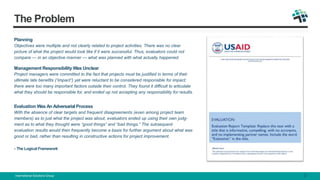 The document discusses planning and implementing an M&E (monitoring and evaluation) MIS (management information system) for projects. It notes that historically monitoring has taken a backseat to evaluation, but adaptive management and agile programming now demand iterative data collection. An M&E MIS can provide timely data for decision-makers if planned properly from the start with clear objectives, management responsibilities, and evaluation targets. Key steps include assessing existing systems, developing functional specifications, and managing organizational change. The tool's success depends on how problems are defined, how the system is used, and whether data collection and review processes are in place.
