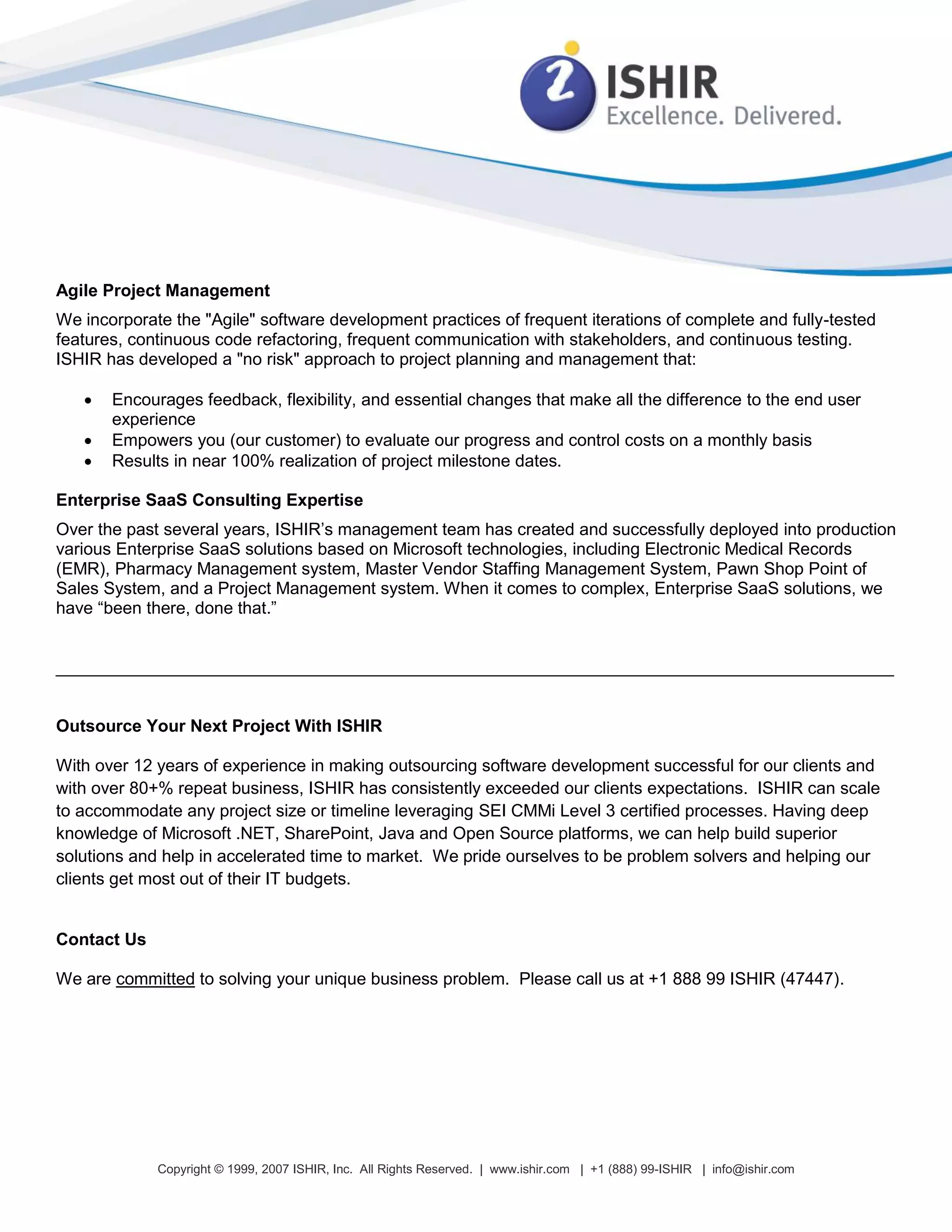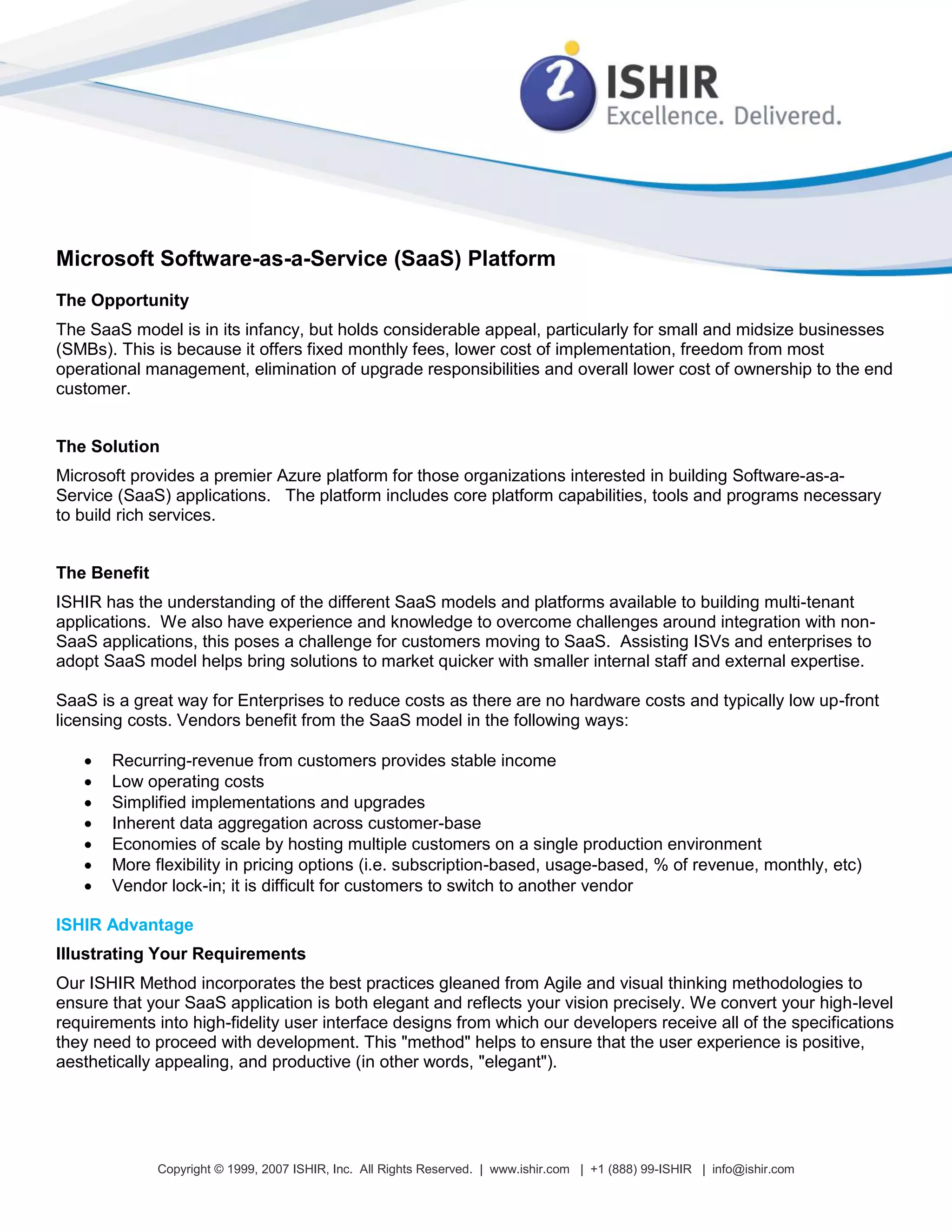 The document discusses the appeal of Microsoft's software-as-a-service (SaaS) platform for small and midsize businesses, highlighting benefits such as lower costs and operational management freedom. It outlines Ishir's expertise in SaaS application development, agile project management, and the successful deployment of enterprise SaaS solutions using Microsoft technologies. Ishir positions itself as a reliable partner for outsourcing projects, promising superior solutions and a commitment to client satisfaction.