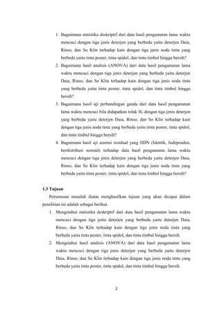 Dokumen ini membahas tentang desain eksperimen, khususnya percobaan faktorial yang digunakan untuk menguji efektivitas tiga jenis deterjen terhadap berbagai noda tinta pada kain. Penelitian ini bertujuan untuk menganalisis waktu pencucian serta interaksi antara deterjen dan noda dengan menggunakan statistika deskriptif dan analisis ragam (ANOVA). Melalui pengujian ini, diharapkan dapat memberikan pemahaman serta aplikatif dalam kehidupan sehari-hari, terutama bagi ibu rumah tangga.