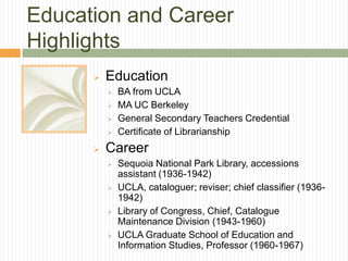Seymour Lubetzky was a prominent 20th century cataloguing theorist, teacher, and librarian. He received degrees from UCLA and UC Berkeley and worked at the Sequoia National Park Library, UCLA, and the Library of Congress over his long career. Lubetzky published several influential works on cataloging rules and principles and played a major role in developing international cataloging standards and the Anglo-American Cataloguing Rules. He made lasting contributions to the field of cataloguing over nearly sixty years of work.