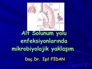 ALT SOLUNUM YOLUİNFEKSİYONLARINDA İNCELENECEK ÖRNEKLER Balgam İndükte balgam Mide suyu Endotrakeal aspirat Transtrakeal aspirasyon Bronkoalveolar lavaj (BAL) Akciğer biopsi örnekleri