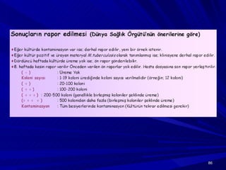 Balgam toplanması Hastaeğitimi Balgam toplanmasından 1-2 saat öncesi gıda alınmaması Sabah balgamı tercih Ağzın steril su ile çalkalanması (?) Öksürük ile derinden gelen balgam Balgam örneğinin steril kaba alımı Hızla laboratuvara ulaştırma Balgam örneğini bekletmeden boyama ve ekim Balgam işlenmesi gecikecekse, buzdolabında bekletme