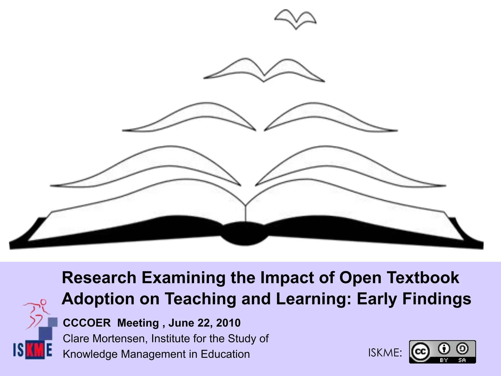 The document presents early findings on the impact of open textbook adoption on teaching and learning, focusing on institutional support, the creation and use of open textbooks, and the benefits and challenges associated with their implementation. Interviews with faculty reveal that open textbooks enhance interactive learning and faculty collaboration while providing financial savings for students. The next steps include further analysis and dissemination of findings aimed at contributing to peer-reviewed research in educational practices.
