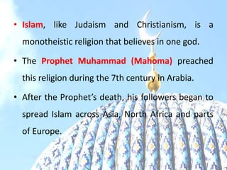 Islam originated in the 7th century in the Arabian Peninsula. The prophet Muhammad received revelations from God and began preaching the religion of Islam. After Muhammad's death, his followers spread Islam across Asia, North Africa, and parts of Europe. Islam is a monotheistic faith that believes in one God and that Muhammad is his final prophet. The religion's core beliefs and practices are outlined in the Five Pillars of Islam.