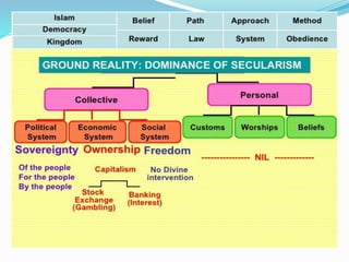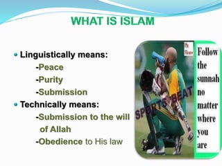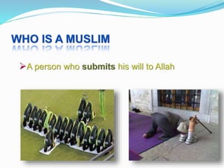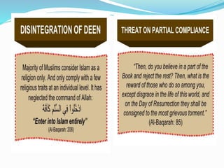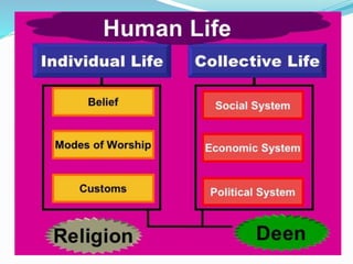 This document discusses Ibrahim (Abraham) and his willingness to sacrifice his son Ismail at God's command, as described in the Quran. It also discusses how Ibrahim fully submitted to God's will and laid Ismail prostrate before sacrificing him, at which point God called out to Ibrahim, confirming that he had fulfilled the dream. The document contrasts the concepts of religion and deen, stating that deen refers to a comprehensive system of life encompassing all beliefs, intellectual, moral and practical aspects. It provides an overview of the different components that make up the Islamic code of life, including articles of faith, modes of worship, ethics, social and political systems. The document also shares had
