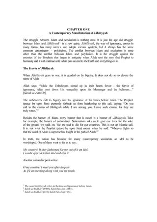 This document discusses the conflict between Islam and secularism. It argues that secularism is a contemporary manifestation of jahiliyyah (ignorance) and is fundamentally at odds with Islamic monotheism. Secularism restricts Islam to the mosque and seeks to govern society without Islamic law, which constitutes polytheism. The document outlines how secularism entered Muslim lands through the influence of hypocritical secularists, using Turkey as an example. It concludes that secularism has no place in Muslim societies due to Islam's all-encompassing nature and the historical compatibility of Islam with science.