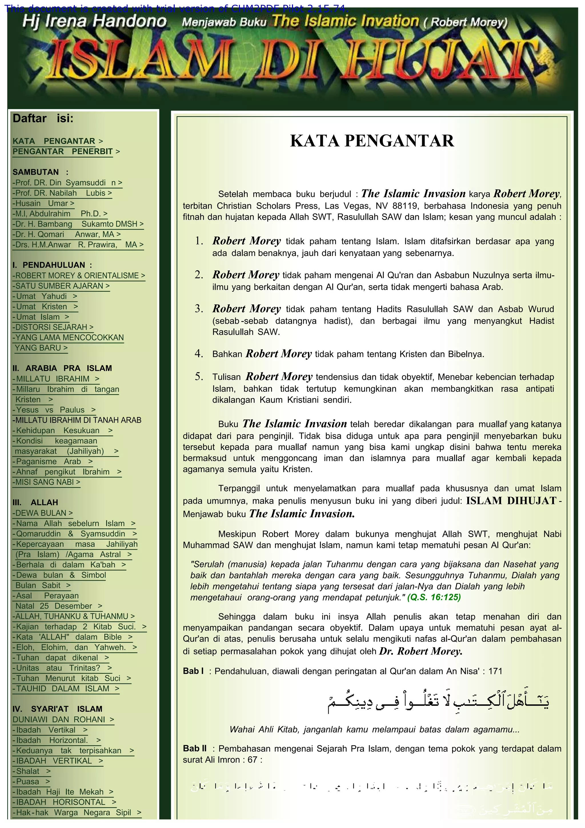 Buku ini memberikan tanggapan terhadap buku "The Islamic Invasion" karya Robert Morey yang dianggap mengandung fitnah dan hujatan terhadap Allah SWT, Rasulullah SAW, dan Islam. Tulisan ini berusaha menjelaskan pemahaman Islam yang sebenarnya secara bijak dan baik melalui 7 bab yang mendiskusikan topik-topik utama yang dihujat dengan mengambil tema-tema dari ayat-ayat Al-Quran dan Hadist Nabi.