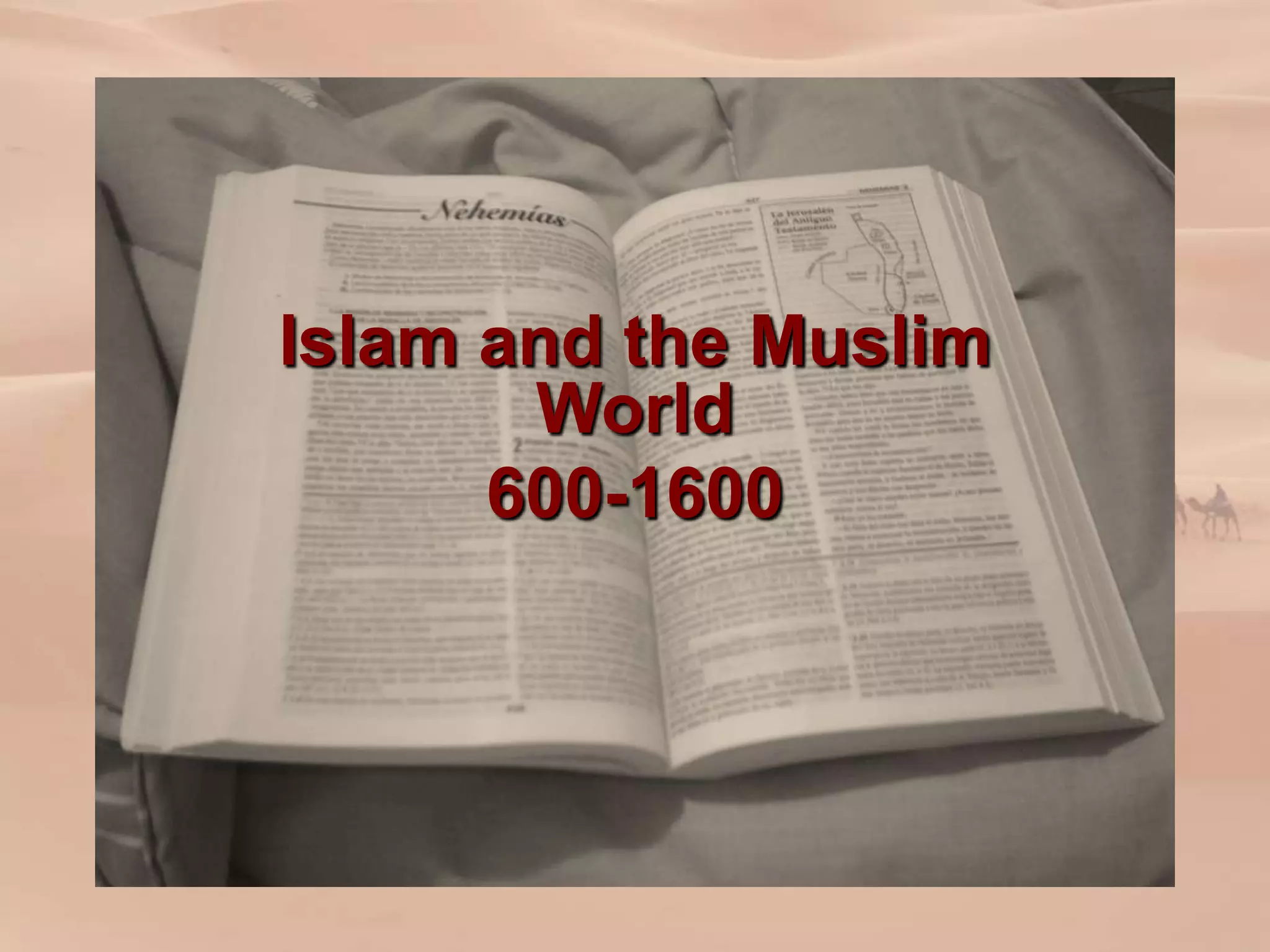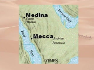 1) The Arabian Peninsula in the 7th century was dominated by desert and home to nomadic Bedouin tribes. Important trading cities like Mecca and Medina were influenced by Bedouin traders and conducted trade between Asia and the Mediterranean.