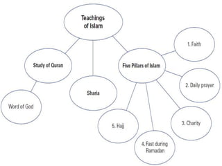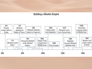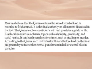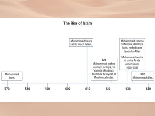 2) Muhammad was born in 570 CE in Mecca and began receiving revelations from God in 610 CE that became the basis of the Quran and new monotheistic religion of Islam. He gained followers by preaching in Mecca and Medina and helped mediate conflicts between tribes.