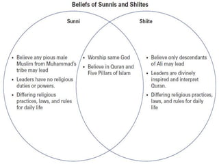 3) After Muhammad's death in 632 CE, divisions arose over religious and political leadership of the Muslim community, splitting it into the Sunni and Shia branches that still