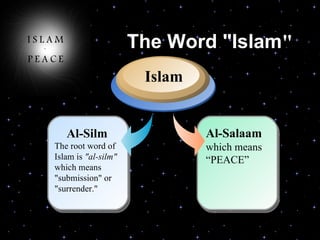 The document discusses Islamic principles of peace, diversity, and prohibiting violence. It explains that Islam means peace, the roots of the word Islam mean submission to God, and its basic tenets promote peace. It discusses Quranic verses advocating diversity in humanity and rejecting compulsion in religion. It also outlines Islamic rules of war only permitting fighting in self-defense and prohibiting harming non-combatants, as well as requiring peace if the enemy seeks it.