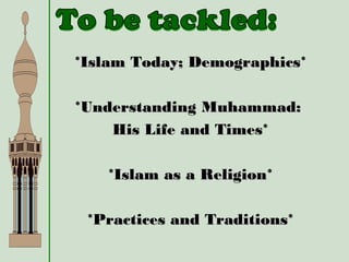 There are approximately 1.2 billion Muslims worldwide, making up around 1/5 of the global population. While only 18% of Muslims live in the Arab world, the largest Muslim populations are found in Indonesia, Pakistan, Bangladesh, India, and Nigeria. The document then provides details on the life and teachings of Muhammad, the main beliefs and practices in Islam including the five pillars of faith, and the religious sites that are central to Islam such as the Kaaba in Mecca.