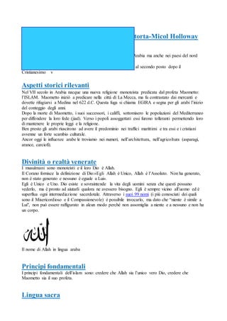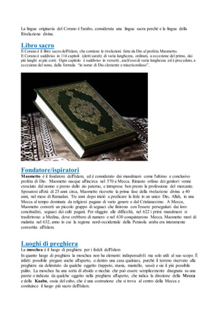 L'islam è una religione monoteista fondata dal profeta Maometto nel VII secolo, che ha avuto origine in Arabia e si è diffusa in Nord Africa e Asia. I musulmani credono in Allah, l'unico Dio, e seguono il Corano, libro sacro suddiviso in surah e versetti. I praticanti osservano cinque pilastri fondamentali, tra cui la preghiera quotidiana e il digiuno durante il Ramadan.