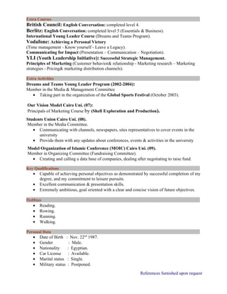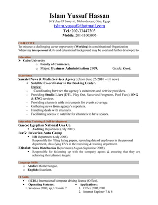 Islam Yussuf Hassan has over 7 years of experience in media and communications. He received a business administration degree from Cairo University in 2009. Currently, he works as a satellite coordinator at Sawatel News & Media Services Agency, where he coordinates between customers and providers to arrange live broadcasts, recorded programs, and news coverage. He also completed internships in auditing, human resources, and sales. Hassan has excellent English and Arabic language skills as well as proficiency in Microsoft Office applications. He enjoys reading, rowing, running, and walking in his free time.