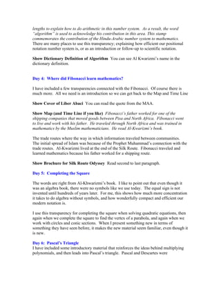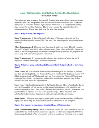 This document provides instructor notes for an 8-day lesson plan exploring the origins and developments of algebra, mathematics, and the number system within Islamic culture and the House of Wisdom in Baghdad. Some key points covered include: