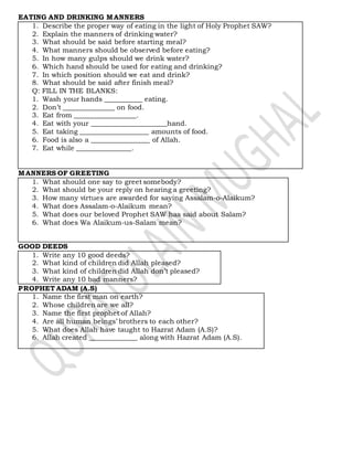 This document contains questions about various topics in Islam including the books of Allah, the pillars of Islam, cleanliness and purity, prayers, getting up early, eating manners, greeting manners, good deeds, and Prophet Adam (peace be upon him). It asks about the number of books revealed by Allah, their purpose, the number of sections in the Quran, virtues for reciting letters, the meaning of religion, pillars of Islam, why Muslims go to the mosque, the month of fasting, giving charity, people Allah likes, necessity of clean clothes, cleaning before prayers, using a toothbrush, importance of cleanliness, a hadith about cleanliness, worshipping Allah, who taught prayers, number of daily prayers,