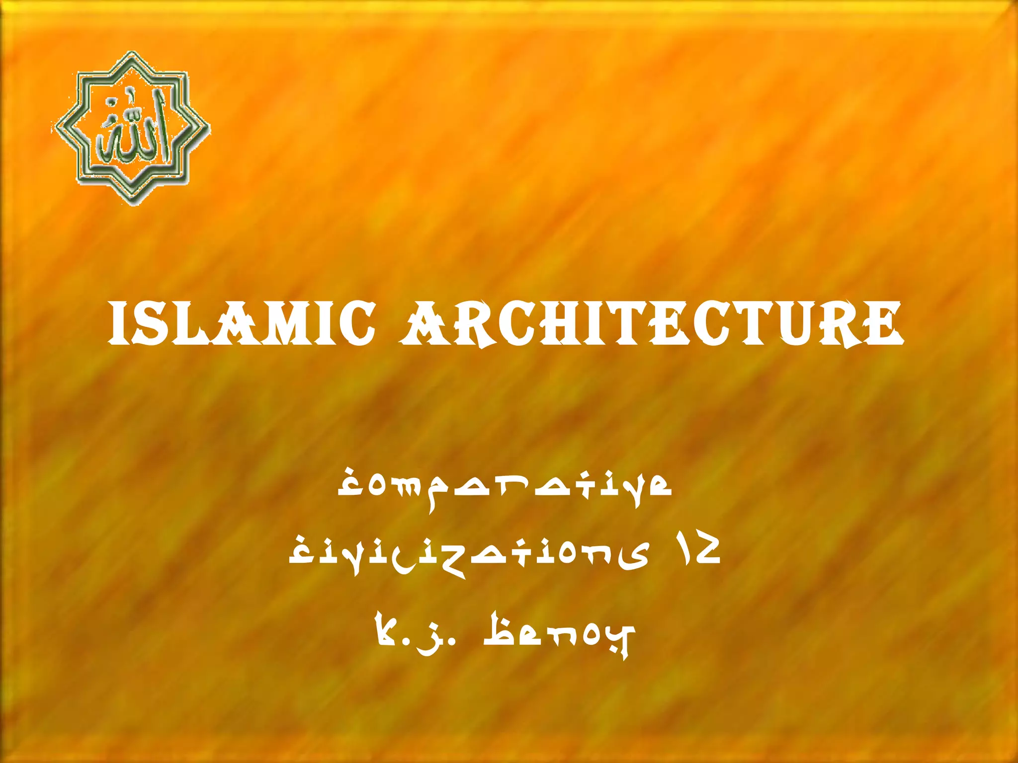Islamic architecture has evolved over time, borrowing from neighboring civilizations. Mosques are the most notable building, originally being open courtyards but now featuring elements like minarets, mihrabs, and minbars. Major mosques include the Grand Mosque in Mecca housing the Kaaba, the Dome of the Rock in Jerusalem, and the Blue Mosque in Istanbul modeled after Hagia Sophia. Regional variations exist like the ziggurat-style minaret in Samarra, Iraq and dome shapes in Iran. Mughal architecture fused Islamic and Hindu styles. The Taj Mahal is a famous mausoleum. Moorish architecture in places like the Alhambra and Mesquita