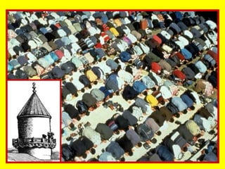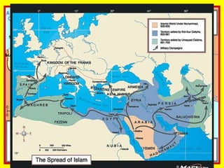 The document discusses the origins and development of Islamic civilization, highlighting the transition from polytheistic practices in pre-Islamic Arabian Peninsula to the establishment of Islam by the prophet Muhammad. It outlines key elements such as the five pillars of Islam, the role of the Quran, and the initial opposition Muhammad faced, leading to the hijrah. The text also touches on the schism between Sunnis and Shiites regarding leadership succession after Muhammad's death.