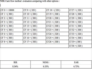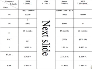 3. Waleed analyzes the costs and rates of different options - KFH ijarah, NBK loan, KFH murabaha, and Aayan leasing. He concludes that KFH ijarah has the lowest nominal interest rate and effective annual rate, making it the best choice.