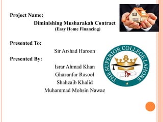 The document presents information on an easy home financing product based on the Islamic financing structure of diminishing musharakah. Key points include:
