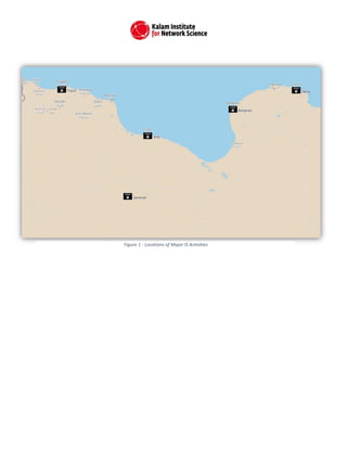 The document outlines the Islamic State's activities and expansion in Libya from late 2014 to early 2015, highlighting significant attacks like the Corinthia hotel bombing and various strategies employed for recruitment and community support. It describes how extremist factions have exploited the political chaos post-Gaddafi to increase their influence, including pledging allegiance to ISIS and executing operations across the country. The conclusions indicate that Libya may become a new stronghold for Islamic extremism if not addressed through coordinated international efforts.