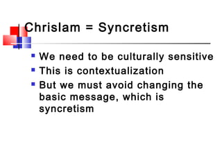 The document discusses issues related to Christian-Muslim relations, specifically addressing the concept of syncretism within Christianity and the challenges of converting Muslims to Christianity without compromising core beliefs. It critiques methodologies like the 'insider movement' and 'camel method' for potentially misleading interpretations of Christianity to make it more palatable to Muslims. It emphasizes the importance of maintaining the integrity of biblical teachings and the necessity of accurately representing the nature of God and Jesus Christ in dialogues with Muslims.