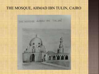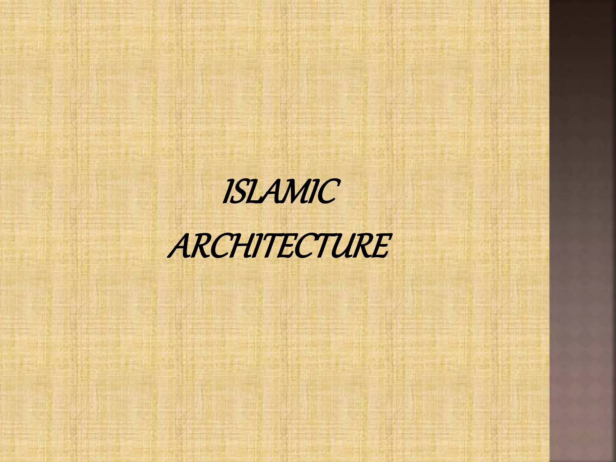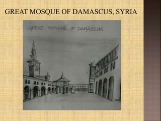 Islamic architecture originated in the 7th century AD during the Islamic conquests. Some key characteristics include courtyards surrounded by arcades, minarets for the call to prayer, and mihrabs indicating the direction of Mecca. Important early examples include the Dome of the Rock in Jerusalem and the Great Mosque of Damascus with its intricate mosaic walls. Over time, regional styles developed like the hypostyle mosques of Iraq and the double-tiered arches of the Great Mosque of Cordoba in Spain. Mosques remain centers of worship and community in Islamic cultures.