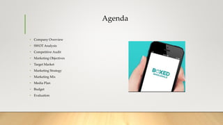 This document presents a social media marketing campaign for Boxed Wholesale targeting affluent millennial moms. It includes an overview of the company, a SWOT analysis, marketing objectives to increase brand awareness and advocacy, influencer selection, a media plan, and budget. Key elements are using influencer Gina Homolka and the hashtag #UnboxedWithBoxed across platforms to drive engagement, referrals tracked by unique codes, and donations to local charities. Evaluation will measure ROI and track social metrics and brand mentions.
