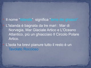 L'Islanda, conosciuta come 'terra dei ghiacci', è circondata da tre mari e presenta un paesaggio prevalentemente roccioso con fenomeni vulcanici come geyser. La sua economia si basa principalmente sulla pesca, l'agricoltura limitata e l'uso del calore geotermico per energia e riscaldamento. La popolazione, composta al 96,6% da islandesi, è oggetto di studi genetici per analizzare le origini di varie malattie.