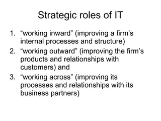 The document discusses three strategic roles of information technology: working inward to improve internal processes, working outward to enhance products and customer relationships, and working across to strengthen partnerships. It provides examples of companies using IT in these ways, such as creating intranets, customizing online customer experiences, and coordinating closely with suppliers. While opportunities are vast, the document notes IT management should focus on risks, costs, and avoiding overspending.
