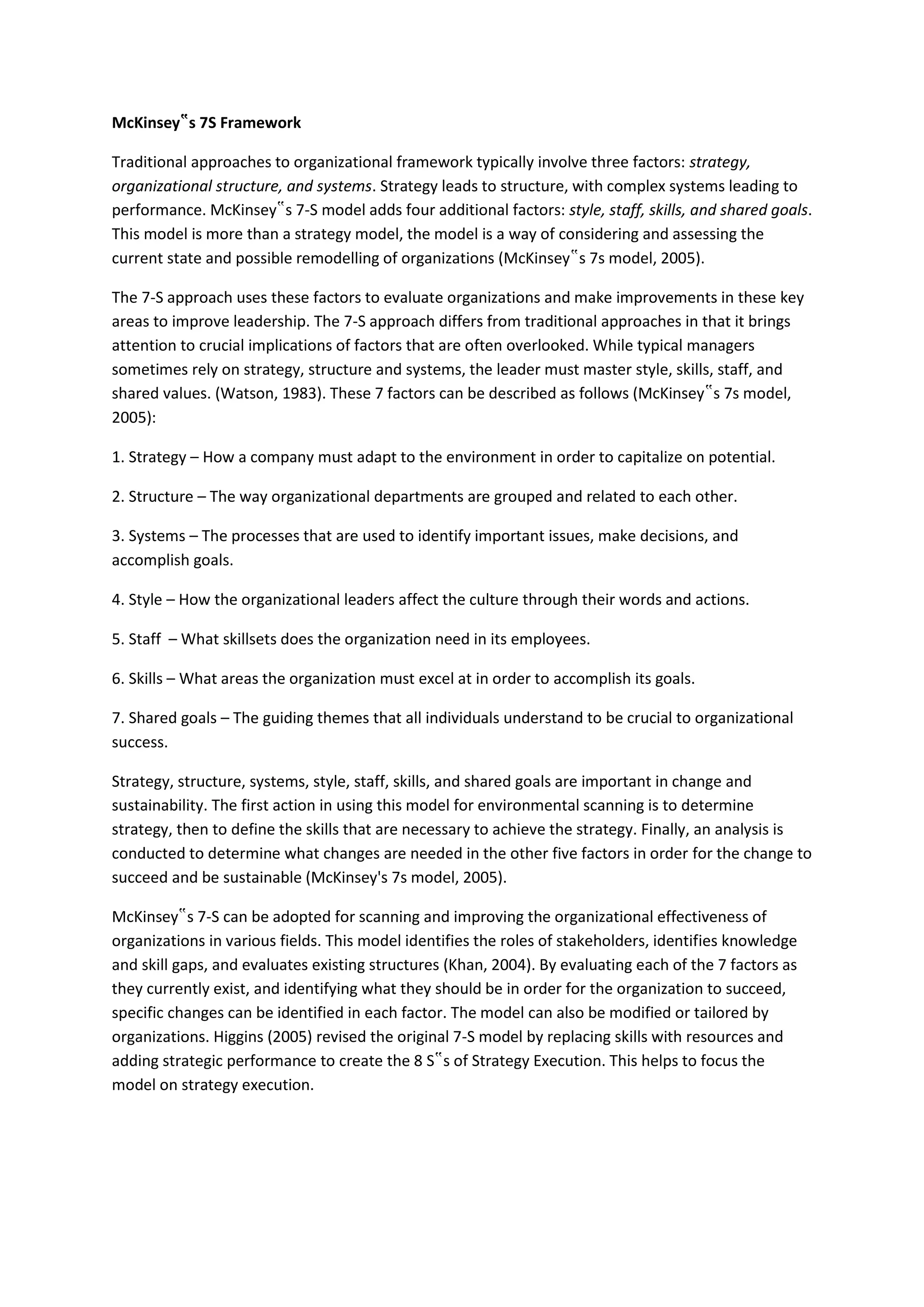 McKinsey's 7S Framework adds four additional factors - style, staff, skills, and shared goals - to the traditional three factors of organizational framework: strategy, structure, and systems. The 7S approach uses these seven factors to evaluate organizations and identify improvements in key areas to strengthen leadership. Each of the seven factors - strategy, structure, systems, style, staff, skills, and shared goals - are important to consider when planning and implementing organizational change to ensure sustainability. McKinsey's 7S model can be used to scan an organization, identify gaps, and evaluate structures to pinpoint specific changes needed across the seven factors for the organization to succeed.