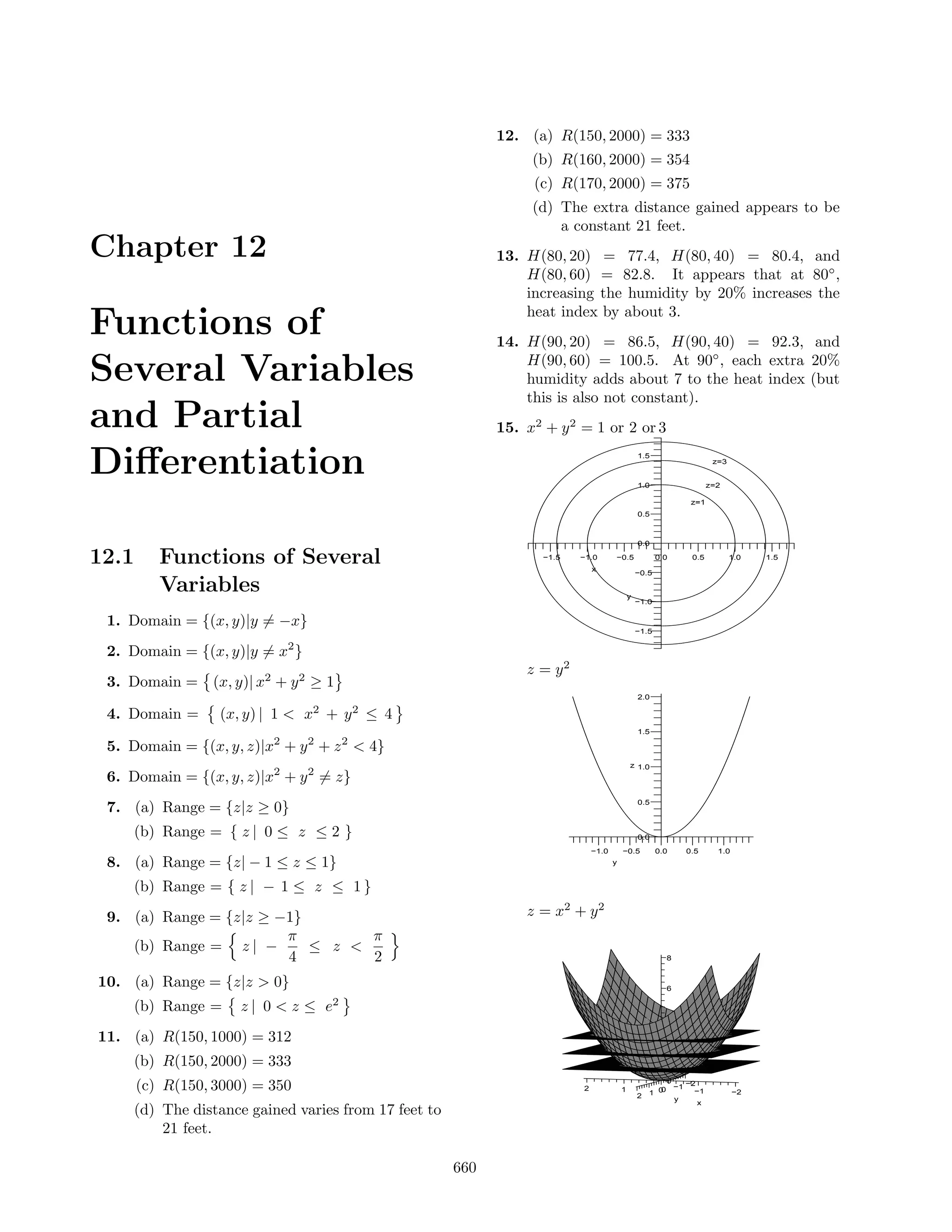 The document contains examples of functions of several variables and their domains and ranges. It provides equations for various functions and graphs their surfaces over different domains. Some key examples include functions defined by equations like x2 + y2 = 1, 2, 3 and functions where increasing one variable by a fixed amount increases the output by a fixed amount.