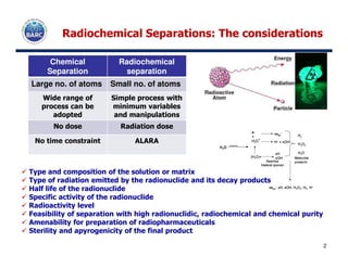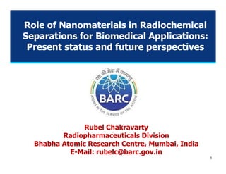 This document discusses the use of nanomaterials in radiochemical separations for biomedical applications. It summarizes the development of four radiochemical separation systems/generators using nanomaterials: 1) 99Mo/99mTc generator for SPECT imaging, 2) 68Ge/68Ga generator for PET imaging, 3) 188W/188Re generator for therapy, and 4) 77Ge/77As generator. The nanomaterial-based generators demonstrated excellent separation yields and purity of daughter radionuclides, as well as consistent performance throughout shelf-life. This novel approach overcomes limitations of conventional generators and establishes protocols for global acceptance of new radiochemical separation systems.