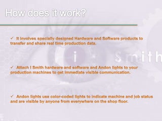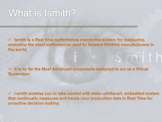 This document describes the features and benefits of Ismith's real-time monitoring system for manufacturing. The system allows users to generate standard or custom reports on a scheduled basis, monitor key performance indicators and production trends in real time, view quality and equipment efficiency data in a centralized hub, and improve visibility into maintenance costs and downtime issues. It captures all relevant production data automatically without paperwork, providing instant feedback and alerts, unlike traditional monitoring systems which have inaccurate, slow data collection.