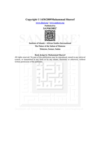 This document contains information about the book "The Great Name of Allah" written by Shehu Uthman Dan Fuduye. It includes secrets and intrinsic qualities of the divine names Allah, ar-Rahman, and ar-Raheem. Reciting these names in certain ways or writing them down can help with needs, cure illness, gain control over spirits, take revenge on enemies, improve memory, and more. The document also contains a prayer by Shaykh Ma`aruf al-Karkhi seeking Allah's help.