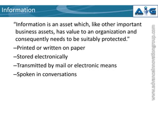 This document provides an introduction to ISO 27001, an internationally recognized standard for information security management. It defines information security as preserving the confidentiality, integrity and availability of information. ISO 27001 describes a structured methodology for establishing an Information Security Management System (ISMS) based on best practices. The standard takes a holistic approach, balancing physical, technical, procedural and personnel security controls. It outlines five mandatory requirements for an ISMS including management responsibility, internal audits, and management review. The standard also describes 11 domains of information security and the documentation required in an ISMS.