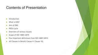 The document outlines ISO 14001:2015 awareness training, focusing on the Environmental Management System (EMS) and its importance in promoting sustainable practices within organizations. It covers the aims of EMS, key clauses of the standard, and the processes for planning, implementation, and continual improvement to enhance environmental performance. The training emphasizes leadership commitment, compliance obligations, risk management, and effective communication as essential components for achieving successful EMS outcomes.