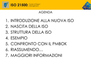 Il documento presenta la ISO 21500, una guida al project management sviluppata con la partecipazione di 37 nazioni, mirando a standardizzare terminologie e processi per facilitare la gestione dei progetti a livello internazionale. Viene confrontata con il PMBOK, evidenziando differenze nelle definizioni e organizzazione dei processi, così come nei concetti di stakeholder e risorse. La ISO 21500 non si propone come soluzione definitiva, ma come un framework flessibile per supportare pratiche di gestione dei progetti.