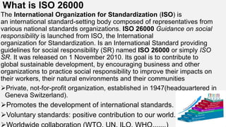 ISO 26000 provides guidance for organizations on operating in a socially responsible manner. It addresses seven core subjects of social responsibility: organizational governance, human rights, labor practices, the environment, fair operating practices, consumer issues, and community involvement and development. ISO 26000 is intended to help organizations implement more socially responsible practices to improve their impact on workers, the natural environment, and communities. However, it does not include requirements and is not certifiable like some other ISO standards.