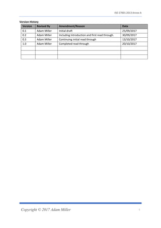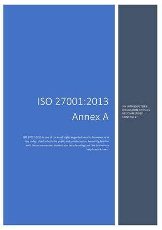 The document provides an introductory discussion on ISO's recommended controls in ISO 27001:2013 Annex A. It begins with an introduction that describes ISO 27001 and 27002 standards and the purpose of analyzing the recommended controls. It then provides a detailed explanation of each control categorized under different security topics, with the goal of helping readers better understand the requirements of ISO 27001 certification. The document contains in-depth coverage of over 50 controls across various security categories.