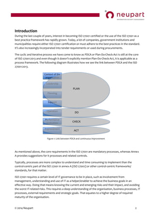 The document discusses the increasing importance of ISO 27001 certification for organizations seeking to improve their information security governance and risk management processes. It emphasizes the cyclical PDCA approach as fundamental to the ISO 27001:2013 standard and outlines the necessity for effective measurement of ISMS processes to ensure alignment with business strategies and improvements in risk management. A series of suggested measurement points and metrics are provided to help organizations evaluate their ISMS effectiveness and compliance with security obligations.