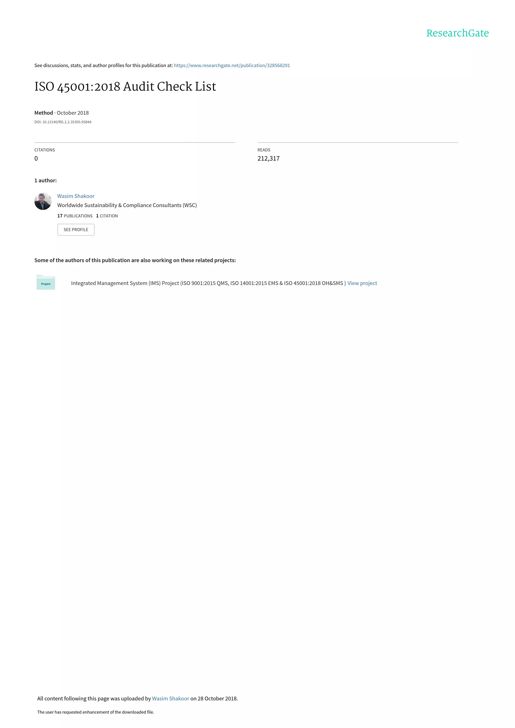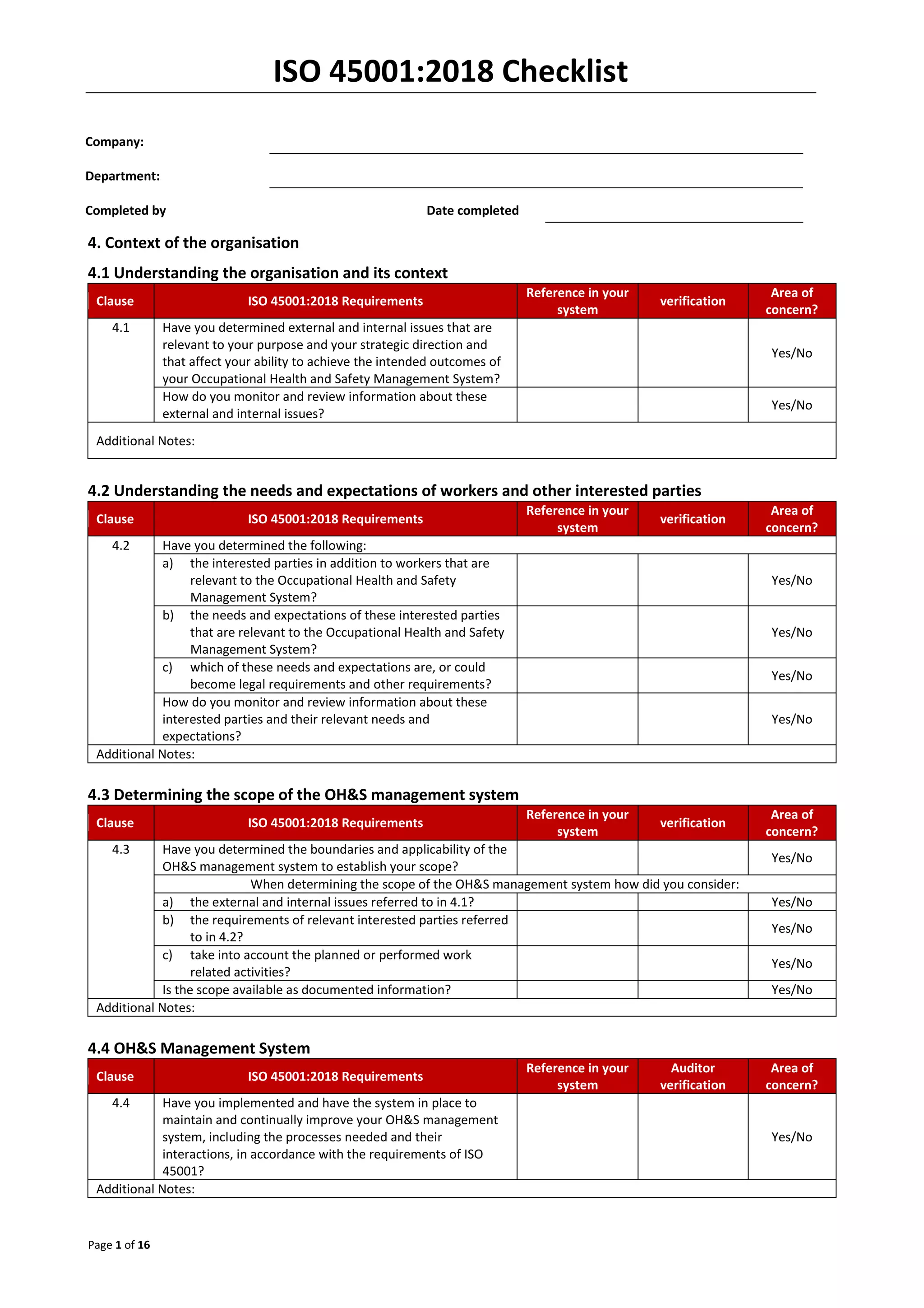 The document is an audit checklist for ISO 45001:2018, the international standard for occupational health and safety management systems. It contains questions to verify if an organization's system meets the requirements of ISO 45001 in areas such as leadership, planning, risk assessment, legal compliance, consultation with workers, and performance evaluation. The checklist covers the main clauses of ISO 45001 across 16 pages with questions, references to the organization's documentation, and areas to note any concerns.