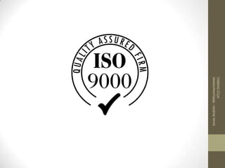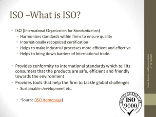 ISO (International Organization for Standardization) establishes international standards to ensure quality, efficiency, and safety. The ISO 9000 series focuses on quality management. ISO 9001 provides a framework for quality management systems certification. Certification can increase customer satisfaction, productivity and profitability. Other standards like ISO 14001 address environmental management systems and ISO 26001 provides guidance on social responsibility.
