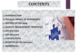 The document is a presentation on ISO 9000, a family of quality management standards aimed at ensuring products and services meet customer requirements and promote continual improvement. It details the history, principles, certification process, and benefits of ISO 9001:2015, as well as guidelines for auditing management systems under ISO 19011:2011. The presentation emphasizes the importance of risk-based thinking and the shift from individual responsibility to holistic organizational accountability in quality management.