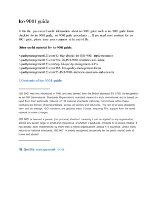 This document provides an overview and guidance on ISO 9001. It begins by explaining that ISO 9001 was first introduced in 1987 and derived from the British standard BS 5750. It aims to keep quality standards up to date with input from national standards institutes. ISO 9001 can be applied to any organization globally. The document then lists and briefly describes several quality management tools used in ISO 9001, including Ishikawa diagrams, histograms, Pareto charts, scatter plots, check sheets, and control charts. It concludes by noting additional related topics like ISO 9001 certification.