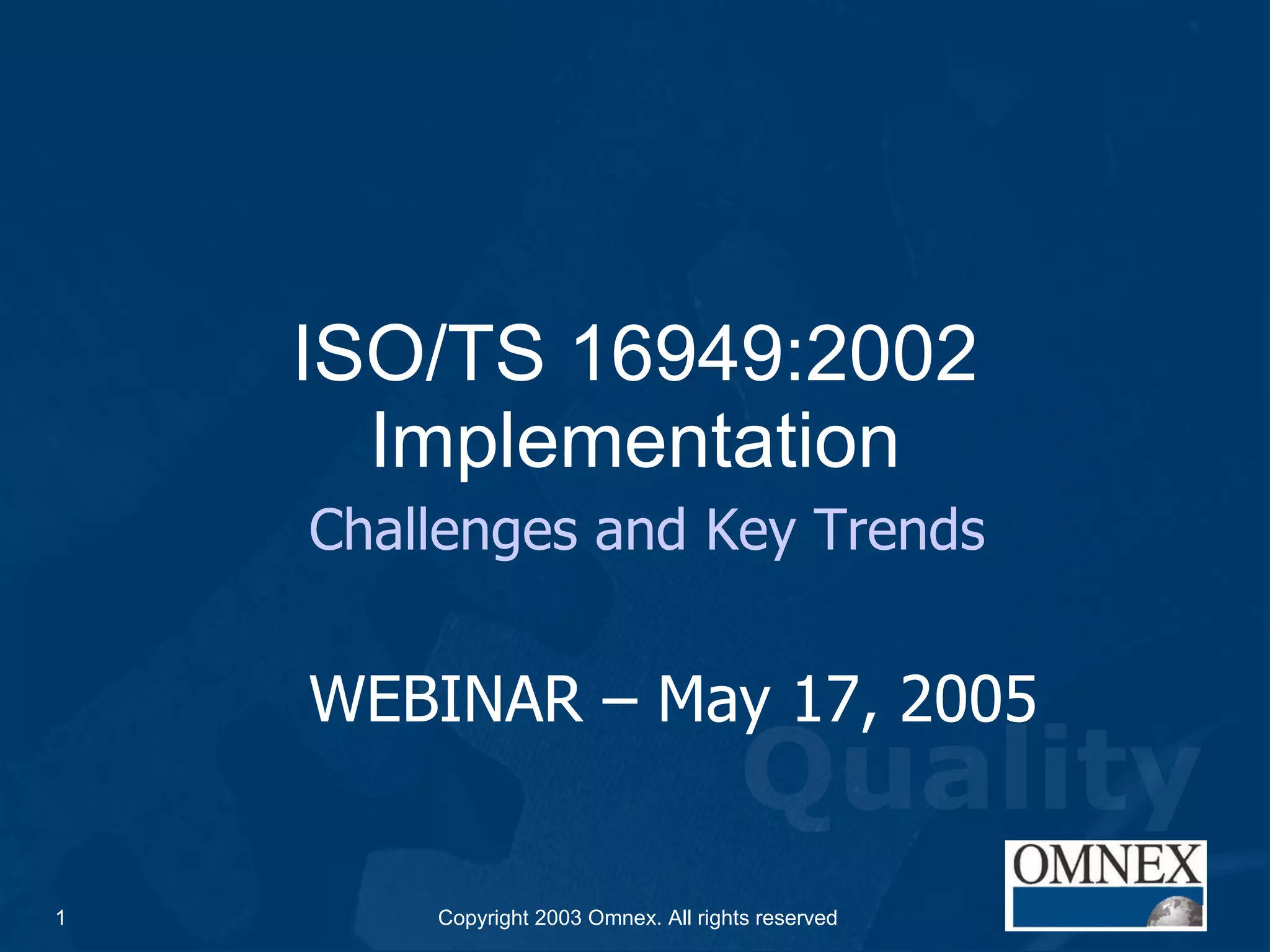 The document discusses key topics in implementing ISO/TS 16949:2002, including transitional challenges, process focus, customer focus, and the automotive approach to process auditing. It outlines a 5-step automotive process audit approach and emphasizes that processes must address both ISO/TS requirements and customer-specific requirements. The webinar agenda also reviews documentation expectations, results and effectiveness expectations, and planning the transition in three phases from planning to roll out and standardization.