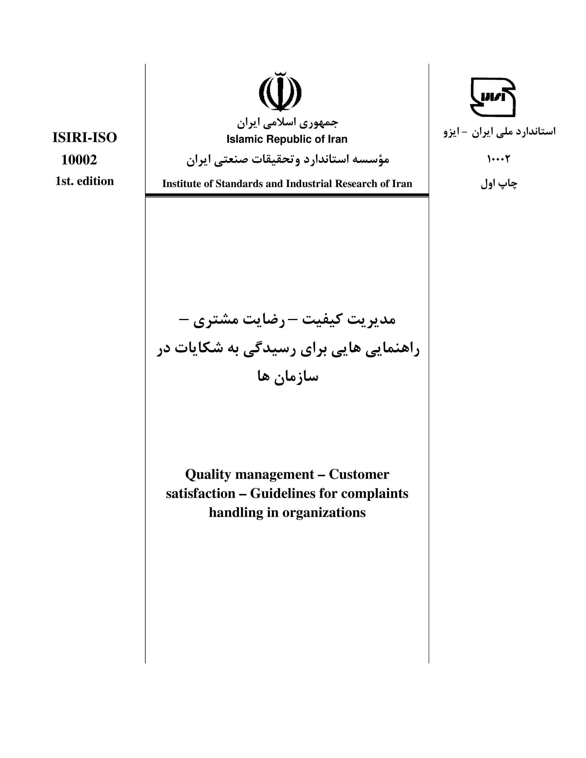 The document outlines the guidelines for handling customer complaints in organizations as per the ISIRI-ISO 10002 standard from the Institute of Standards and Industrial Research of Iran. It provides essential information for improving quality management and customer satisfaction. The document includes contact details and publication information for the institute.